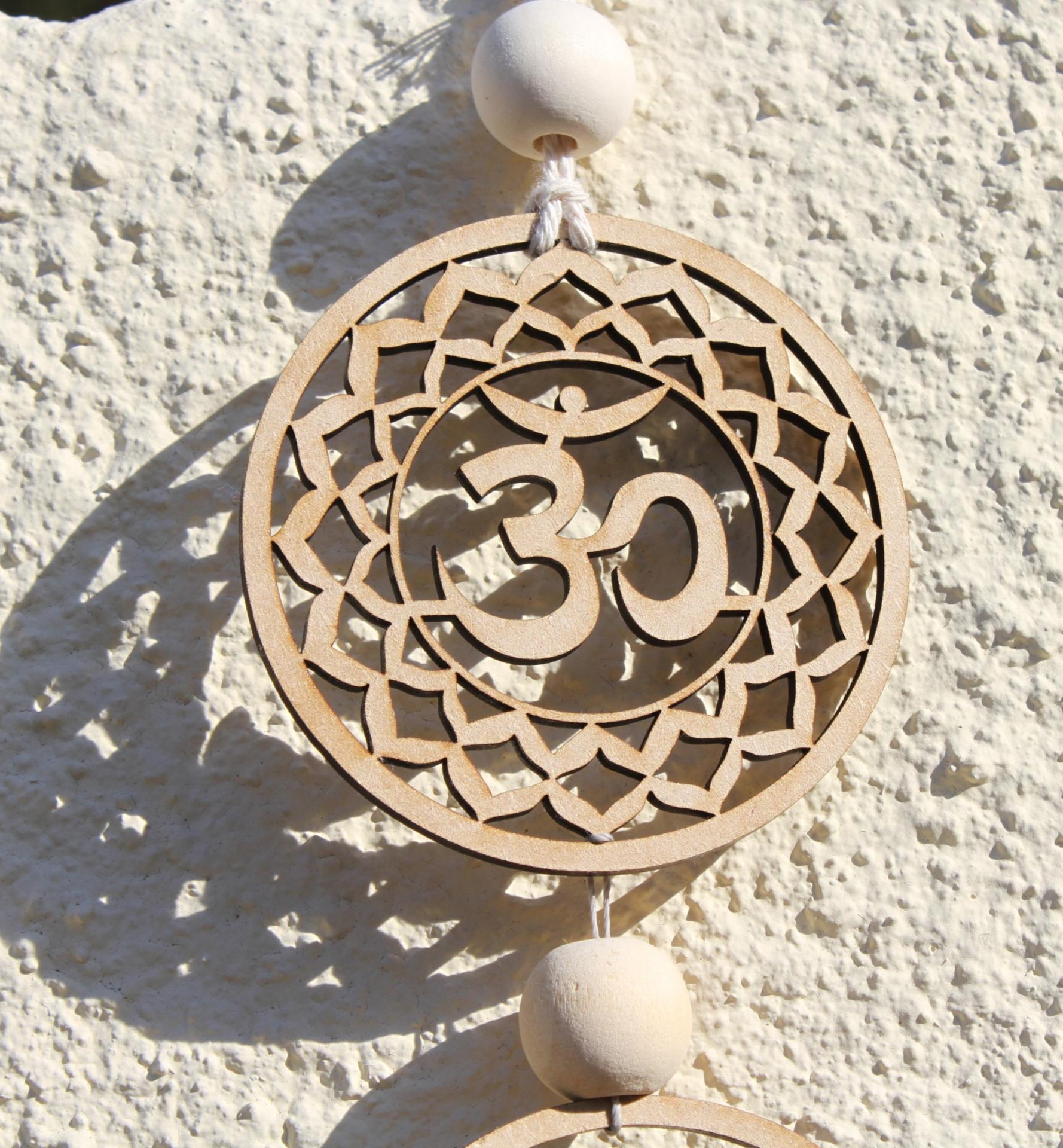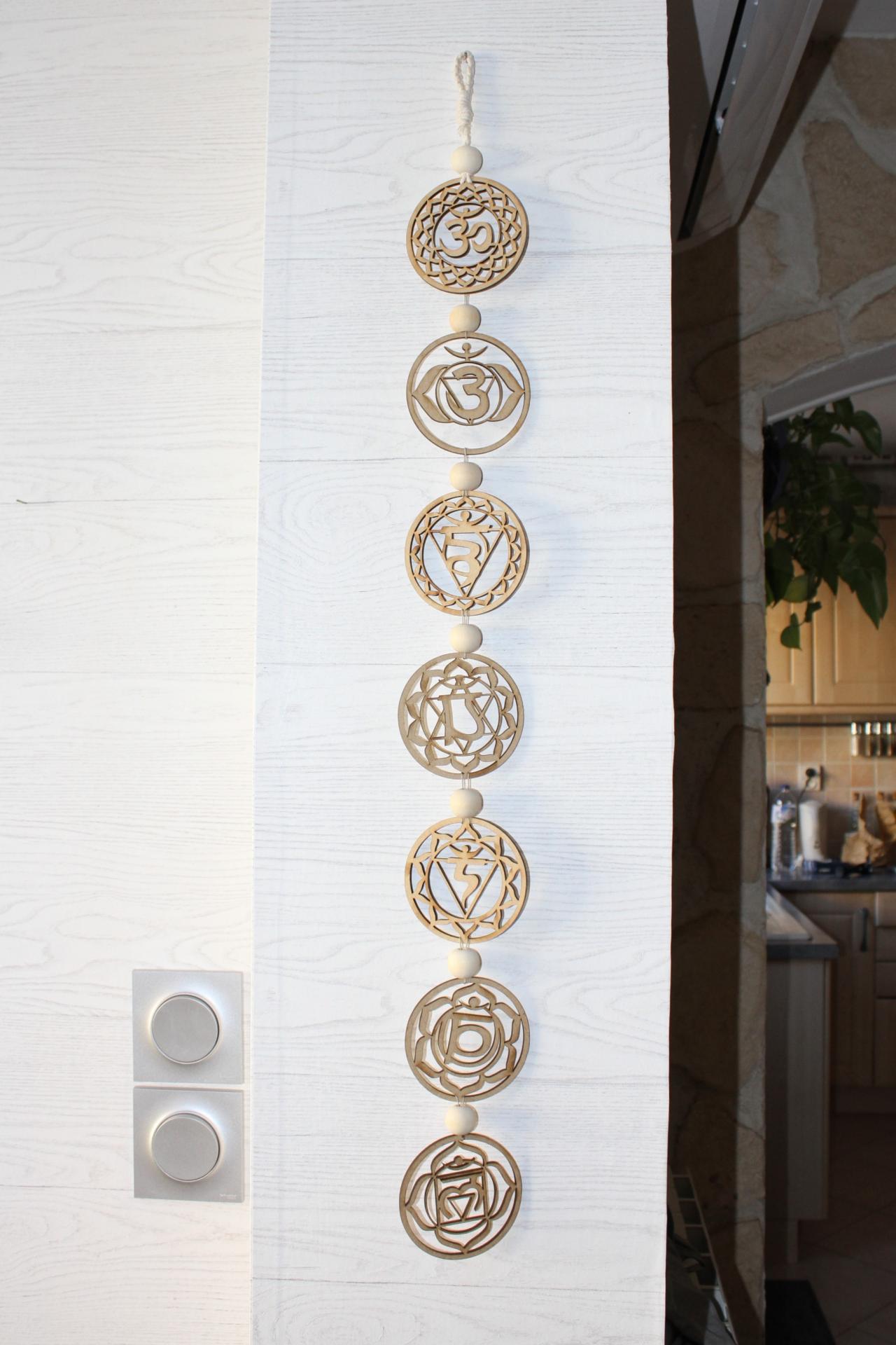 Suspension bois composée de 7 disques représentant les 7 chakras
